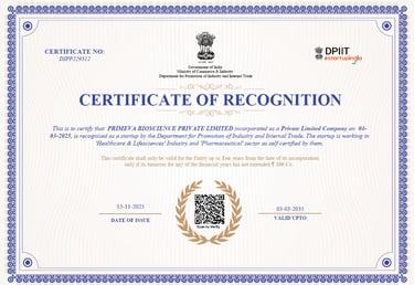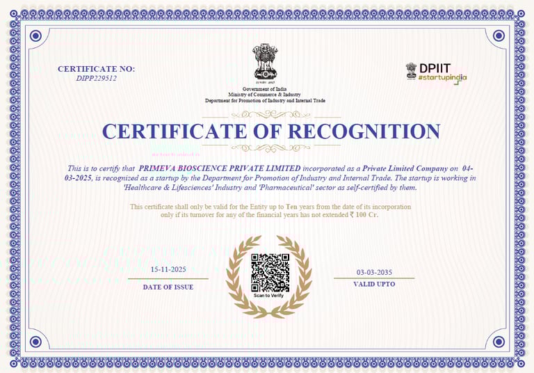 Primeva Bioscience holds Startup India recognition, affirming its status as an innovative startup in the pharmaceutical sector. This certification supports its operations as a private limited entity focused on retail sale of pharmaceuticals and medical goods in Assam, India.